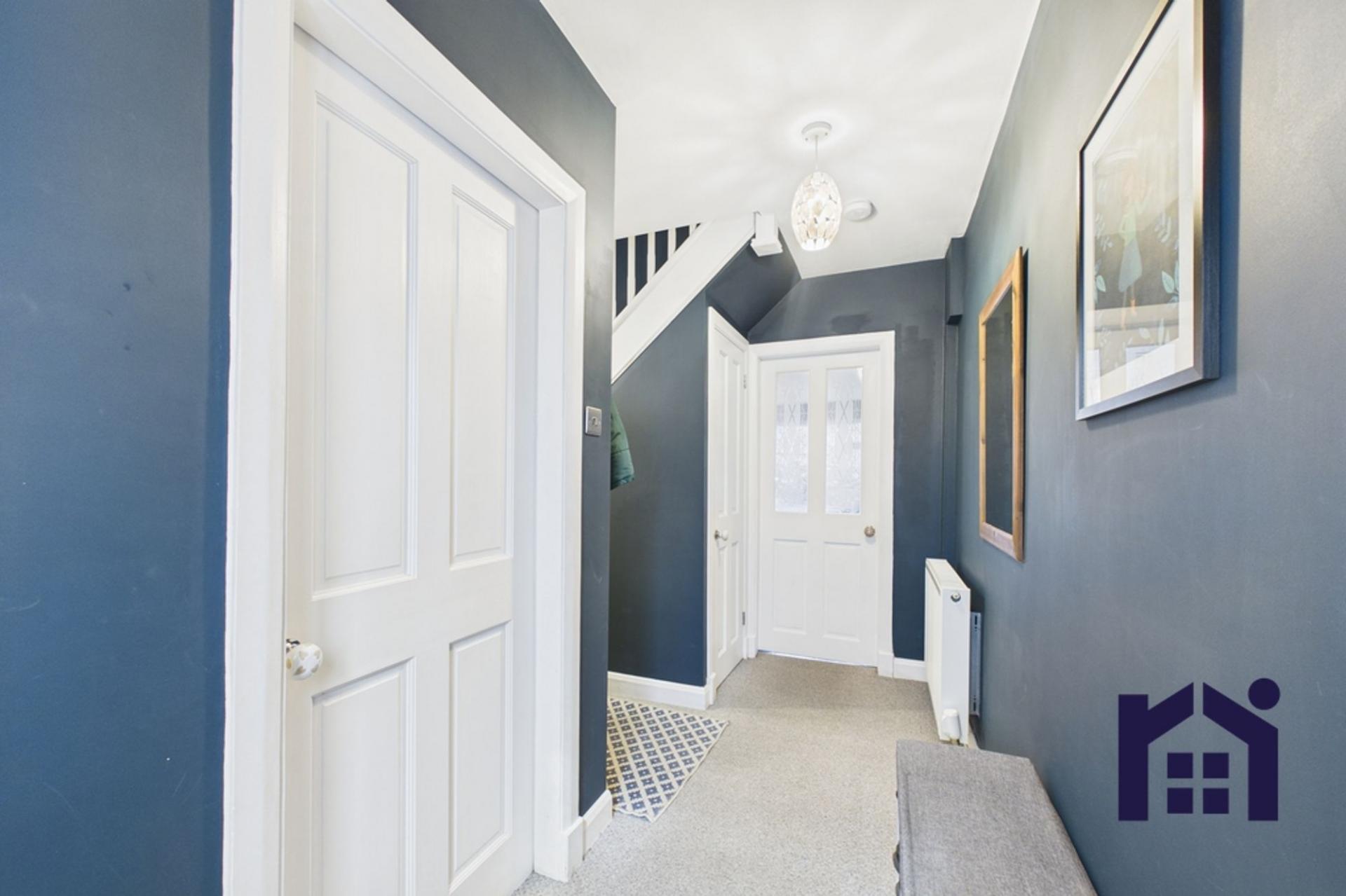 The property is approached via a driveway, providing off-road parking for up to three vehicles. You enter through a porch into a welcoming hallway, offering ample space for coats and shoes, along with a useful understairs storage cupboard.