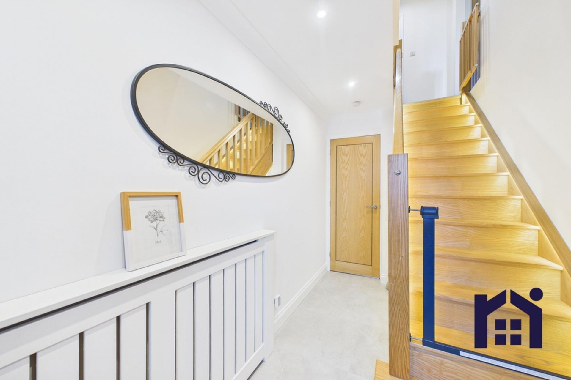 The living room is light and inviting, while to the rear the heart of the home is flooded with natural light from patio doors overlooking the garden and offers ample space for both dining and relaxing. The kitchen comprises a range of wall and base units and a central island topped with quartz work surfaces, incorporating a breakfast bar and etched drainer sink. Integrated appliances by Neff and AEG include an induction hob with downdraft extractor, double electric oven and grill, full height refrigerator and dishwasher.