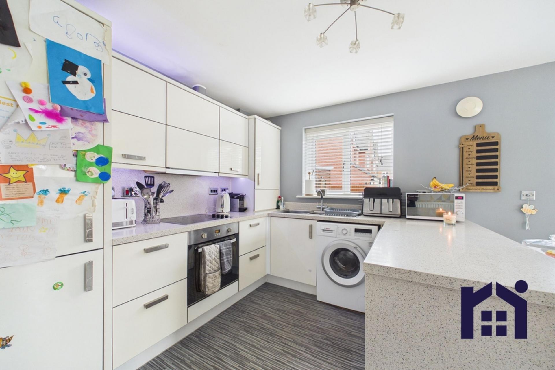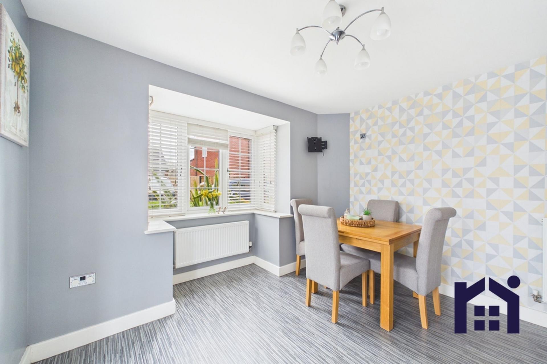 The property occupies an enviable corner plot, benefiting from great outdoor space and off-road parking for up to three vehicles to the side. You are welcomed into a central hallway, where to the right is a spacious living room featuring a large front-facing window, allowing an abundance of natural light to fill the room. To the left of the hallway is a convenient downstairs WC with wash basin. To the rear of the property is a well-designed kitchen diner, fitted with a range of wall and base units in a practical U-shaped layout. The kitchen includes an integrated fridge freezer, electric hob and oven, with additional space and plumbing for a washing machine and dishwasher. A bay window creates a bright dining area, perfect for family meals and entertaining.