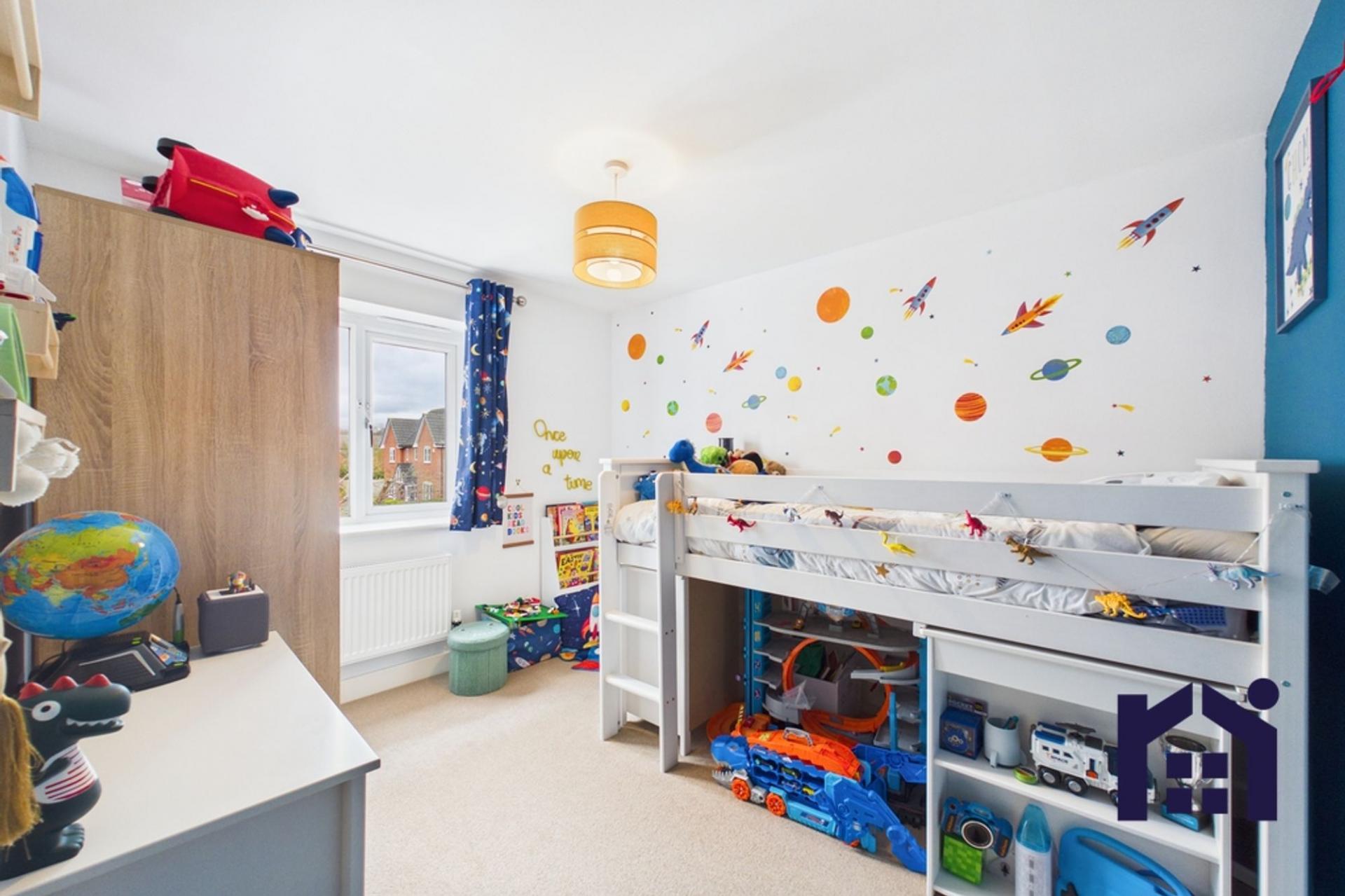 Leading from the kitchen is a versatile sun room, currently used as a playroom, which provides direct access to the garden and further enhances the living space. Externally, the east-facing garden is a pleasant mix of lawn and flagged areas, offering a great space for outdoor enjoyment, with gated access leading to the driveway.