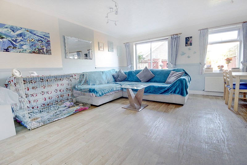 Of L shape. Aspect overlooking the garden with sliding patio doors onto patio. Two radiators, coved and textured ceiling, understairs storage cupboard.