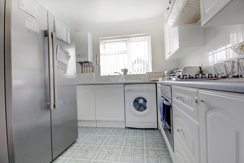 Fitted with a range of working surfaces to two walls with an inset one and a half bowl single drainer sink with mixer tap, a range of white fronted base storage cupboards and drawers below. Space and plumbing for washing machine, inset four burner gas hob with electric oven below and cooker hood over. Wall storage cupboards. Space for upright fridge/freezer. Coved and textured ceiling. Aspect to the front. Part tiled splash backs and recently replace glow worm boiler.