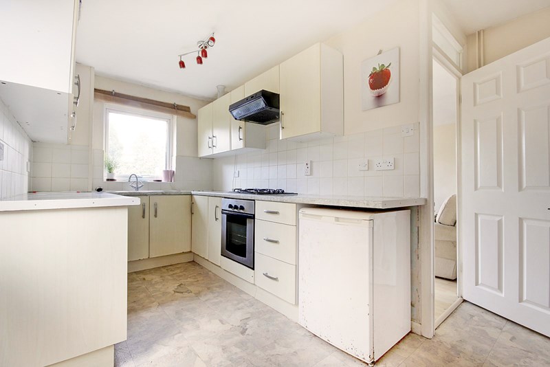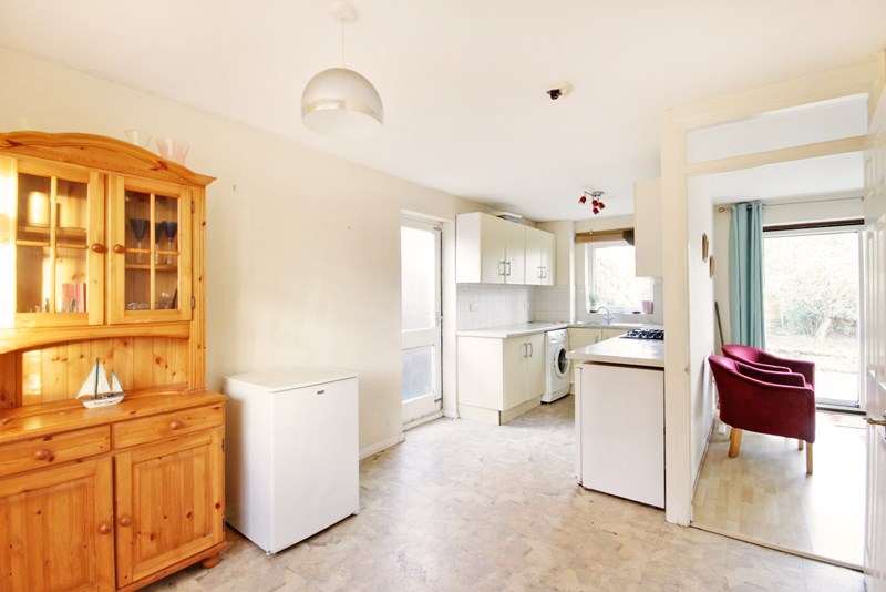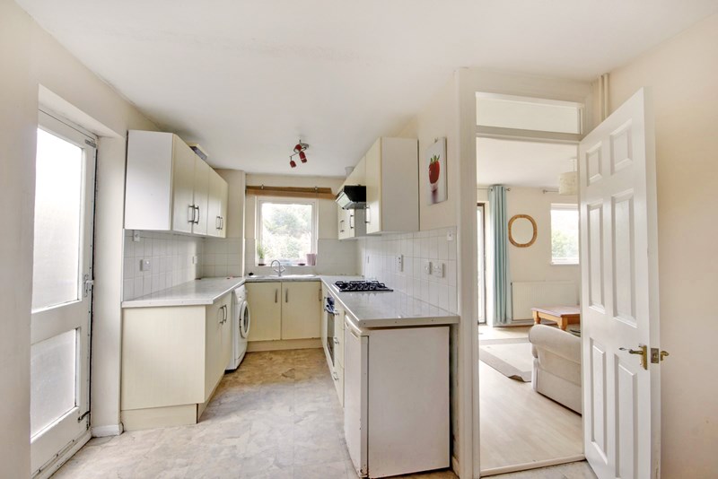 The Kitchen with an aspect overlooking the rear garden and is fitted with a range of work surfaces to 3 sides with an inset single bowl single drainer stainless steel sink with mixer tap and a range of floor storage cupboards below, space and plumbing for washing machine. Inset four burner gas hob with electric oven below and cooker hood over. Wall storage cupboards, part tiled wall surround recess for fridge. Textured ceiling.