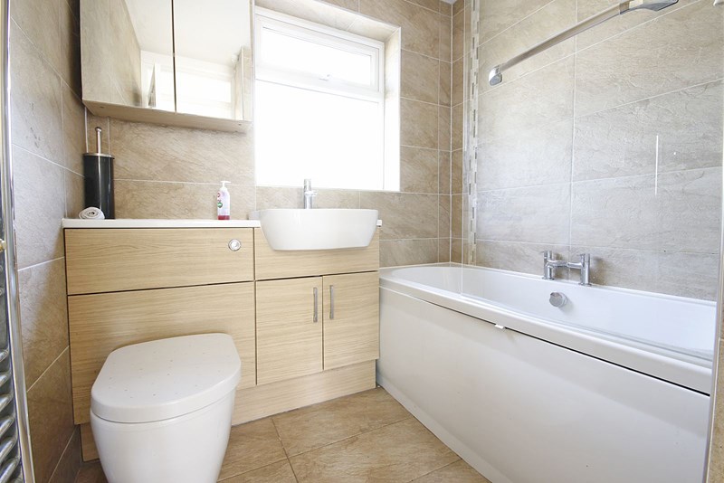 This has been recently modernised and refitted with fully tiled walls and flooring complimenting the contemporary white suite comprising a bath with side mounted mixer tap, mira thermostatic electric shower over and shower screen. Vanity unit with low level w.c. with concealed cistern, inset wash hand hand basin with mono-block mixer tap and cupboard. Mirrored cabinet, chrome ladder style towel radiator, obscure glazed window to the front, textured ceiling and extractor.