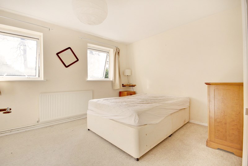 Dual aspect overlooking the garden. Range of built in wardrobes with triple doors hanging rails and shelving, textured ceiling and radiator.