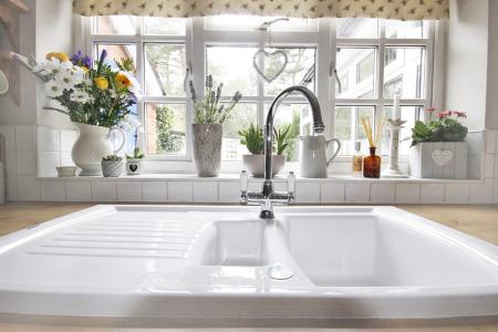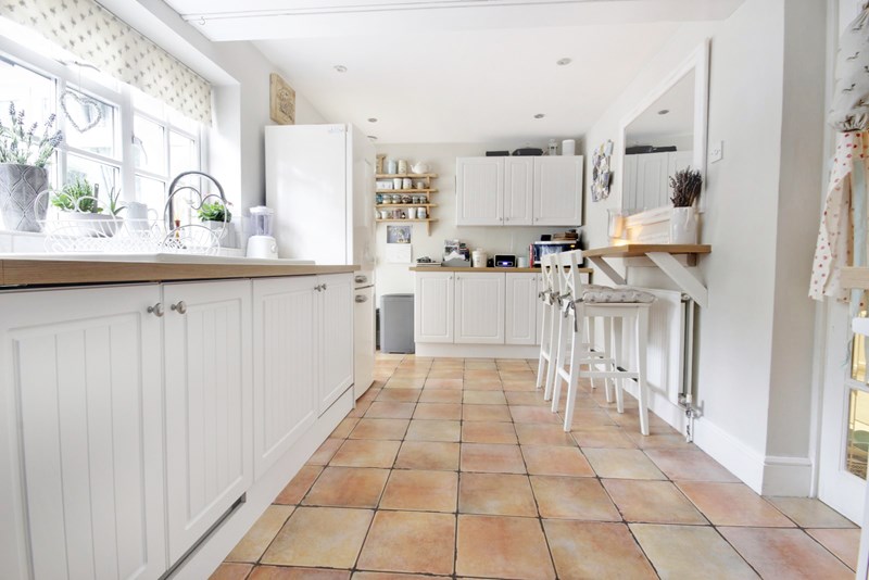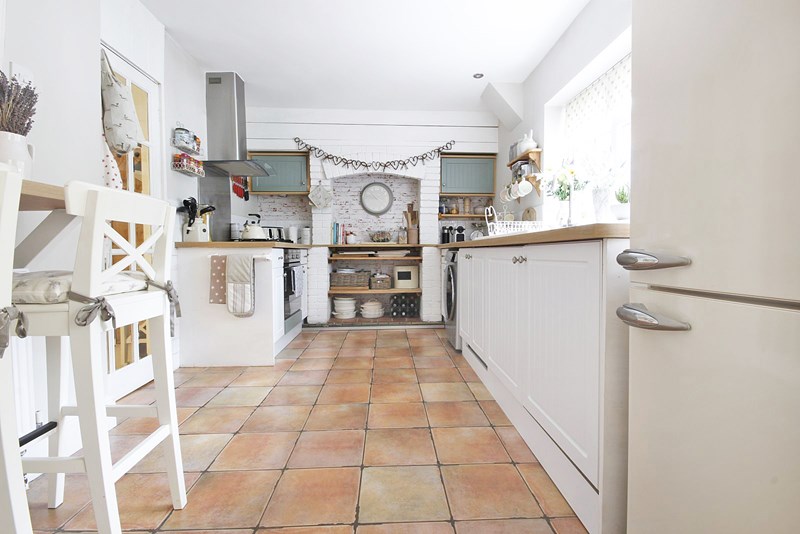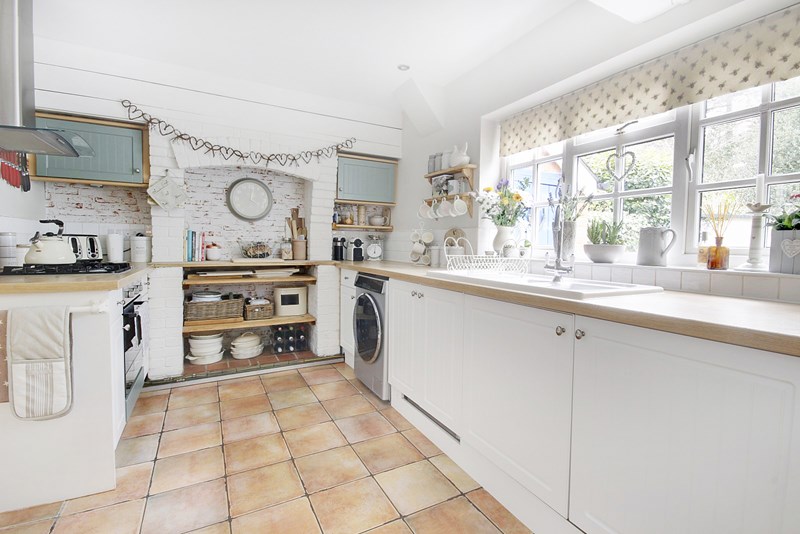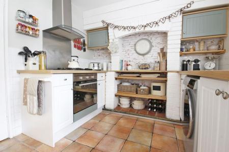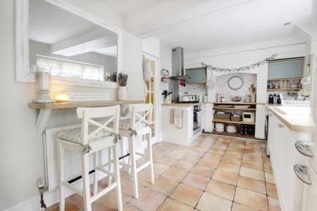 A particular feature of the property, comprehensively fitted with a range of light oak style working surfaces with an inset Blanco one and a half bowl sink with drainer and swan neck mixer tap, range of cupboards below, recess and plumbing for washing machine. Inset four ring diplomat gas fired hob with electric oven below and cooker hood with stainless steel splash back. Further range of base units with matching wall cupboards above, twin wall storage cupboards with contrasting doors, shelving, feature brick chimney breast. Radiator. Breakfast bar, ceramic tiled floor, tiled splash back, ceiling downlights, space for upright fridge/freezer and aspect over the garden.