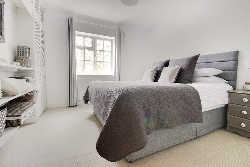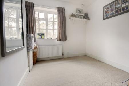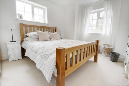 Dual aspect to the front and side overlooking the garden. Range of free standing mirror fronted double wardrobes, radiator and flat set ceiling.