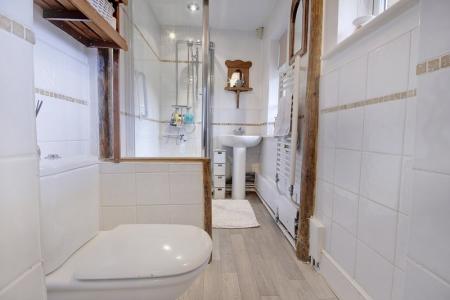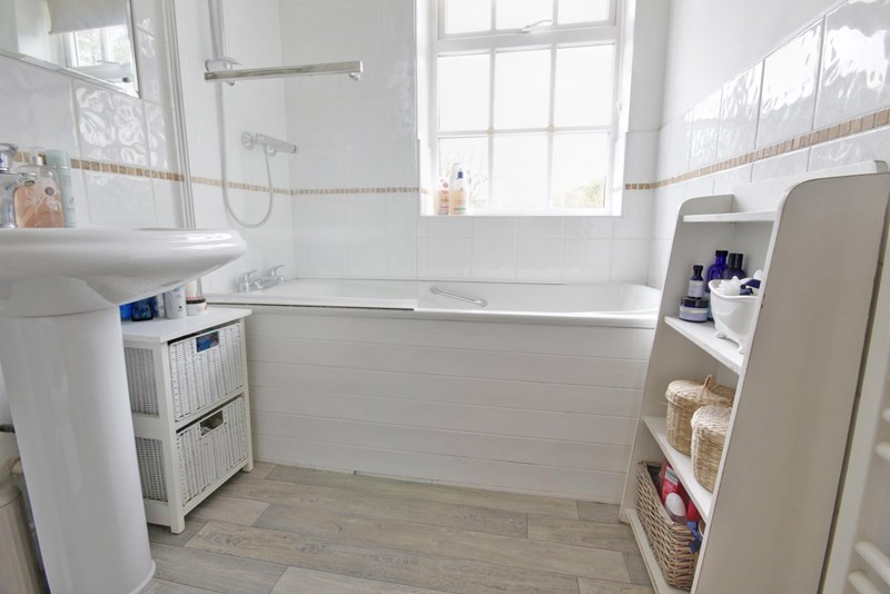 Fitted with a white suit comprising a double sized shower cubicle with thermostatic shower, pedestal basin, low level w.c. part tiled walls and ladder style towel radiator. Window overlooking the garden, access to roof space and extractor.