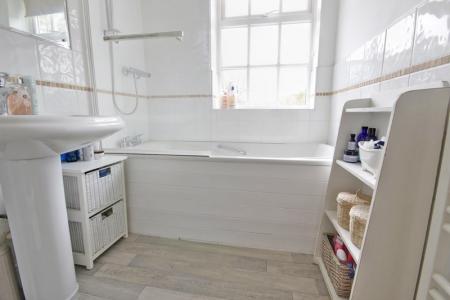 Fitted with a white suite comprising bath with tongue and grooved panelling, mixer tap, thermostatic shower and shower screen, pedestal basin, low level w.c. part tiled wall surround, ladder style towel radiator, down lights textured ceiling and window overlooking the garden.