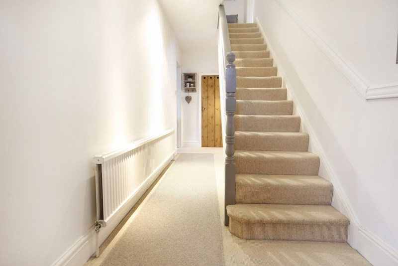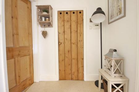Radiator, ceiling downlights, thermostat for central heating, walk in coat and storage cupboard.