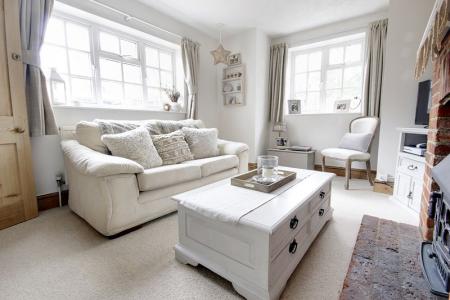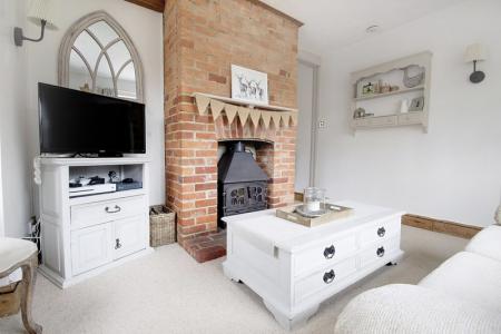 Dual aspect to the front and side overlooking the garden. Feature brick fireplace with brick hearth and inset cast iron wood burning stove. Radiator and textured ceiling. Open way to: