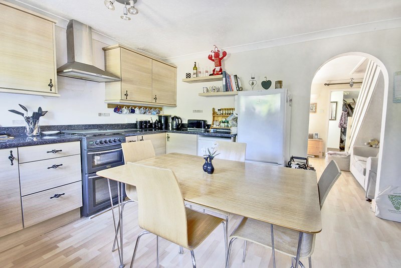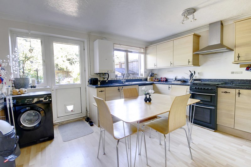 Aspect to rear overlooking the garden and part glazed backdoor. Extensive range of work surfaces to three walls with inset Frankepolycarbonate style one and a half bowl sink and drainer. Range of base storagecupboards and drawers. Recess for fridge, space and plumbing for washing machine,recess for slot in cooker, cooker hood over. Range of wall storage cupboards. Wallmounted Biasi gas fired boiler. Part tiled wall surround. Radiator, coned andtextured ceiling. Laminate style flooring.