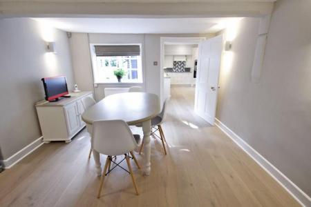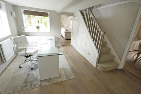 Dual aspect wooden windows front and side aspect overlooking the garden. Fire place with cast iron surround and slate hearth. Radiator, solid oak flooring, smooth finished and beam ceiling, downlights and wall light points.