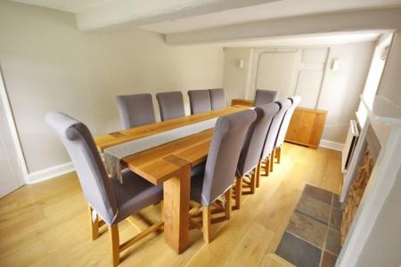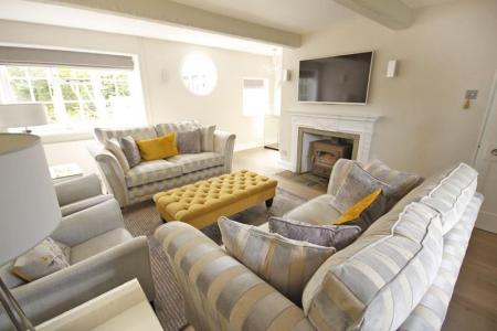 Into recess. A triple aspect room, wooden windows facing the front, side and rear aspect overlooking the gardens. Inset fireplace with Adam style surround with wood burner, wooden mantel over and slate hearth. Points for television over with concealed cabling, terminating connections in the adjoining alcove. Radiators, smooth finished and beamed ceiling, downlights and five wall light points. Chandelier. Engineered oak flooring.