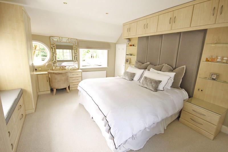 A spacious triple aspect room with wooden casement windows to the front, side and rear aspects overlooking the gardens with black out blinds. Built in window seating, radiators, range of fitted bedroom furniture, smooth finished ceiling, downlights and feature light. Range of wardrobes, dressing unit, drawers under, bedside cabinets with cupboards over, fitted headboard, wall points for T.V.