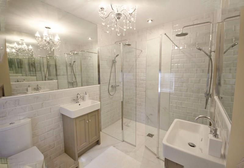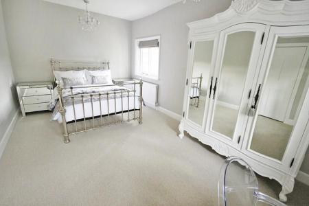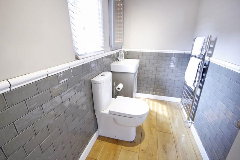 Fitted to a very high standard with a free standing bath with central waste and wall mounted mixer, waterfall style shower over with chrome towel rail. Low level w.c. wash basin in vanity unit with cupboard below and mixer tap, medicine cabinet over with motion sensor lighting. Tiled walls in duo tone colour, part herring bone pattern. Ceramic tiled floor in a wood effect with underfloor heating. Chrome ladder style towel radiator. Ceiling LED chandelier. Extractor. Access to roof space.