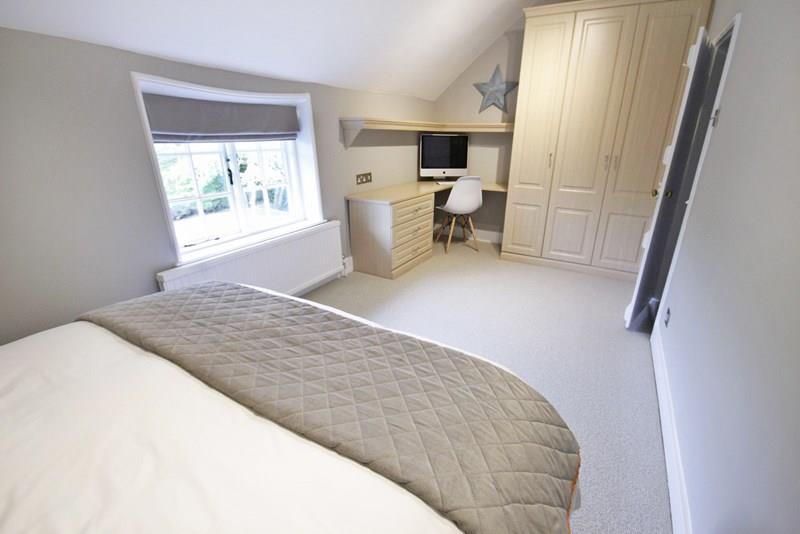 Wooden casement window overlooking the garden, radiator, fitted wardrobe, fitted headboard and bedside cabinets. Fitted study area.
