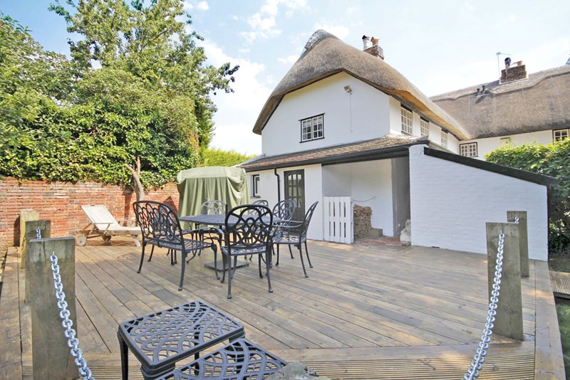 Burton Cottage is an exceptionally well presented Grade 2 listed home of some 2800 sq ft that has just benefited from a complete programme of refurbishment throughout under the guidance of an interior designer and it now presents in a contemporary style that complements the existing character of the house. The extensive works completed by the current owners includes a newly re-thatched roof with a suggested 30-35 year life, replacement of the bathrooms and cloakrooms in a contemporary style with the addition of a double shower to the en-suite, replacement family bathroom, both with underfloor heating and heated mirrors to prevent misting and two high quality re-tiled and fitted cloakrooms. The newly installed lighting includes LED bulbs, feature chandeliers, brushed alloy switch plates and sockets with concealed cabling for wall mounted T.Vs in the living room and master bedroom. On the ground floor there is extensive use of both engineered and solid oak flooring and the upper floor and stairs have been fully re-carpeted. Situated in secluded and private grounds of, we understand from the owner, approximately three quarters of an acre. the garden provides ample parking for a number of vehicles with a large garage together with extensive lawned areas, sun loggia and a decked terrace ideal for entertaining.