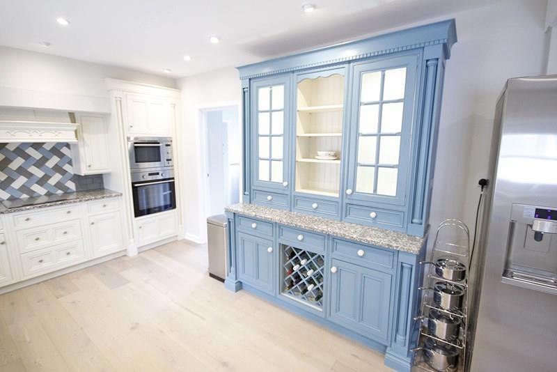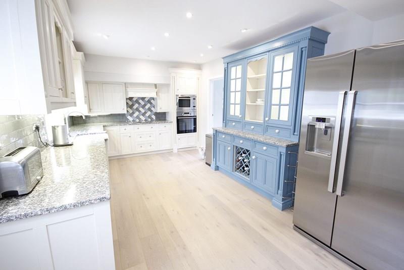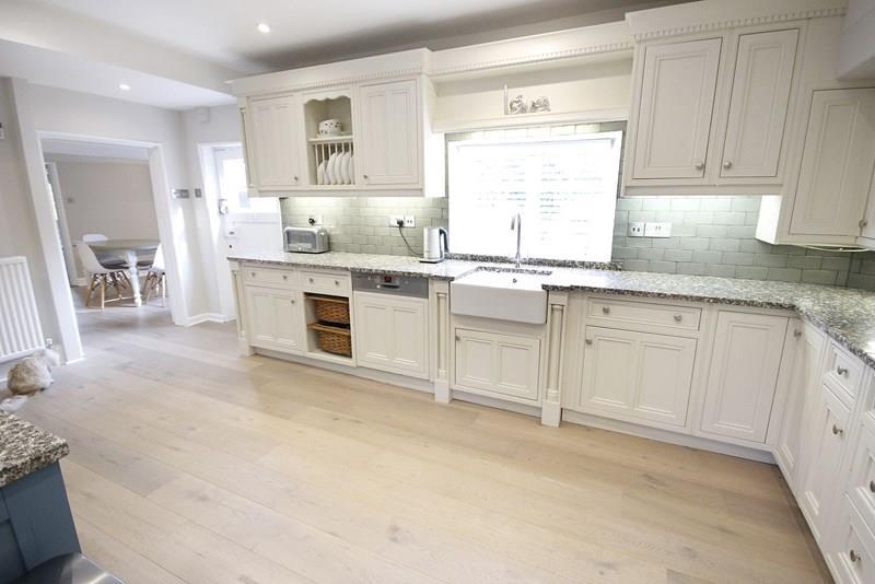 Wooden window to the side aspect overlooking the garden. Side door opening onto the patio. Fitted with a superb hand built and painted fitted kitchen with granite work tops and contrasting dresser style unit including a range of hand built wall, base, display and drawer units, belfast style sink with mixer tap and drainer, integrated electric oven and microwave oven, integrated electric induction hob, with extractor above, integrated dishwasher. Space of american style fridge freezer. Radiator, engineered oak flooring, part tiled walls, smooth finished ceiling, downlights and feature lighting.