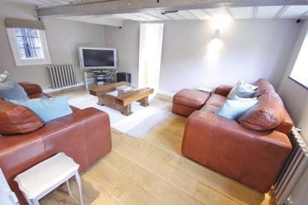Currently used as a family/cinema room. Dual aspect with wooden windows to the rear and side aspect overlooking the courtyard and garden. Fitted screen and projector. Two radiators, solid oak flooring, smooth finished ceiling, three wall light points and downlights.