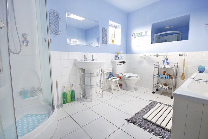 A much larger than average room, fitted with a white suite comprising a walk-in shower cubicle with curved screens, waterfall style shower head and fully jets with hand shower. Low level w.c. and pedestal basin with mono-block mixer tap. Bath with tiled surround and step up, part tiled wall surround ceramic tiled floor, radiator, twin obscure glazed windows, ceiling down lights and extractor.