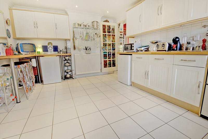 Fitted with a worksurface with an inset stainless steel sink with cupboard below, space for freezer. Floorstanding Worcester green star high flow boiler. Range of wall storage cupboards, cereamic tiled floor, radiator and window to the side.