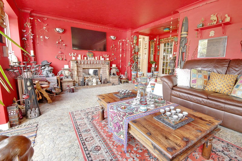 Dual aspect and double opening double glazed doors onto the garden. Coved and textured ceiling, two radiators, oak mock fireplace. Crazy paved floor.