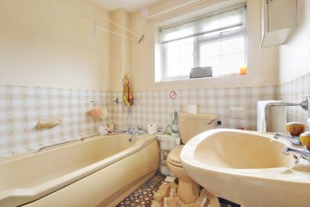 BATHROOM: Being half tiled comprising pedestal wash handbasin, low level w.c., bath with mixer taps, radiator, obscure UPVC doubleglazed window overlooking rear aspect.
