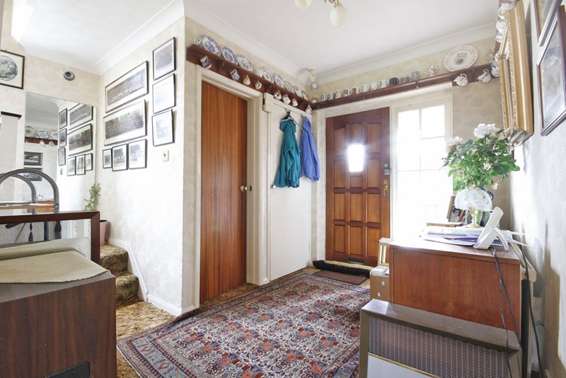 SPACIOUS ENTRANCE HALL: Understairs storage cupboard, radiator,further coats/storage cupboard.