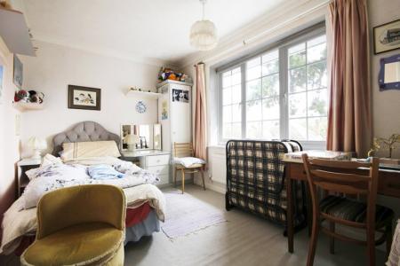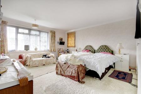 BEDROOM ONE: 14'7" x 14'7" (4.44m x 4.44m) Range of built in wardrobe cupboards, radiator,UPVC double glazed windows overlooking front and side aspects. Door to: