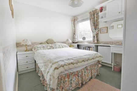 Aspect over the garden. Range of built in wardrobes comprising two doubles with hanging rail and shelving. Dressing table unit with cupboard above and matching bedside cabinets. Radiator.