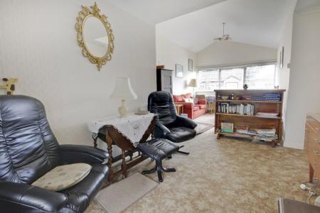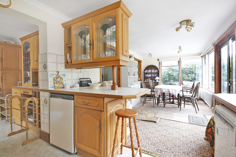 Aspect overlooking the rear garden. Fitted with an extensive range of light oak style fronted units and extensive working surfaces, with an inset one and a half bowl sink with mixer tap, base storage cupboards and drawers below, space and plumbing for a compact dishwasher. Inset solar glow four ring ceramic hob with concealed cooker hood above. Range of wall storage cupboards. 3/4 height unit housing electric oven and grill with cupboards above and drawers below. Recess and plumbing for washing machine. Further range of working surfaces and wall cupboards with shelving. 3/4 height broom cupboard. Recess for a second fridge and under counter gas fired boiler with timer clock and programmer. Dresser style unit with cupboards shelves and wine rack below and glazed crockery cupboard above, breakfast bar with recess for fridge. Radiator, coved and textured ceiling. Glazed UPVC style door to Side. Part tiled wall surround.