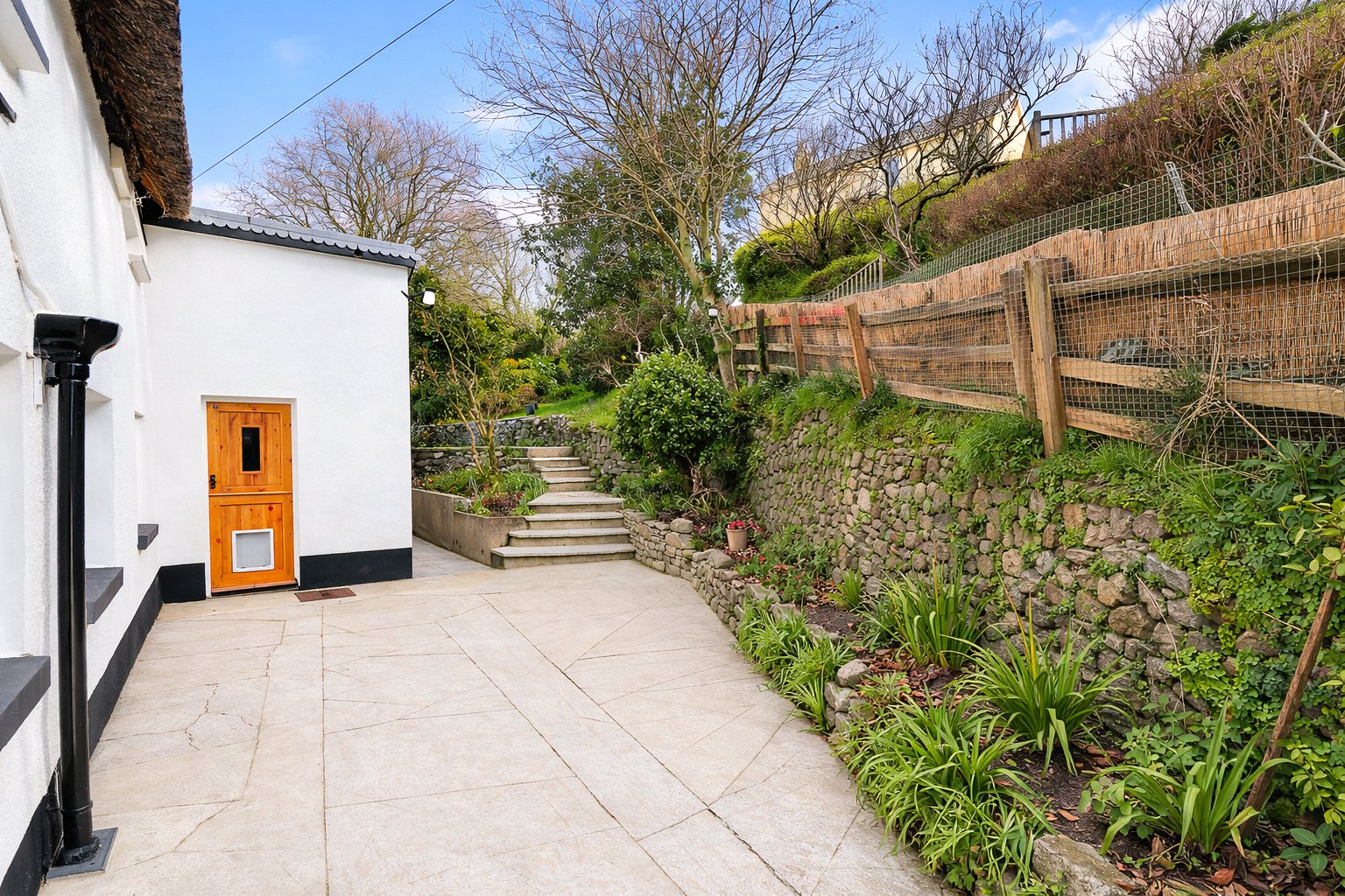 Outside, there is a store running nearly the length of the property, housing the hot water tank. The gardens are arranged to provide a variety of areas to enjoy. A path to the front is bordered by mature shrubs and plants and continues around the cottage. To the side, a walled courtyard offers access through to the rear. Steps rise to the main garden which has been previously landscaped into a raised layout, largely laid to lawn with a further raised level and patio areas. Several mature trees provide structure and privacy, and there is a useful garden shed. Steps then return down towards the cottage, with a gate leading back onto the track.