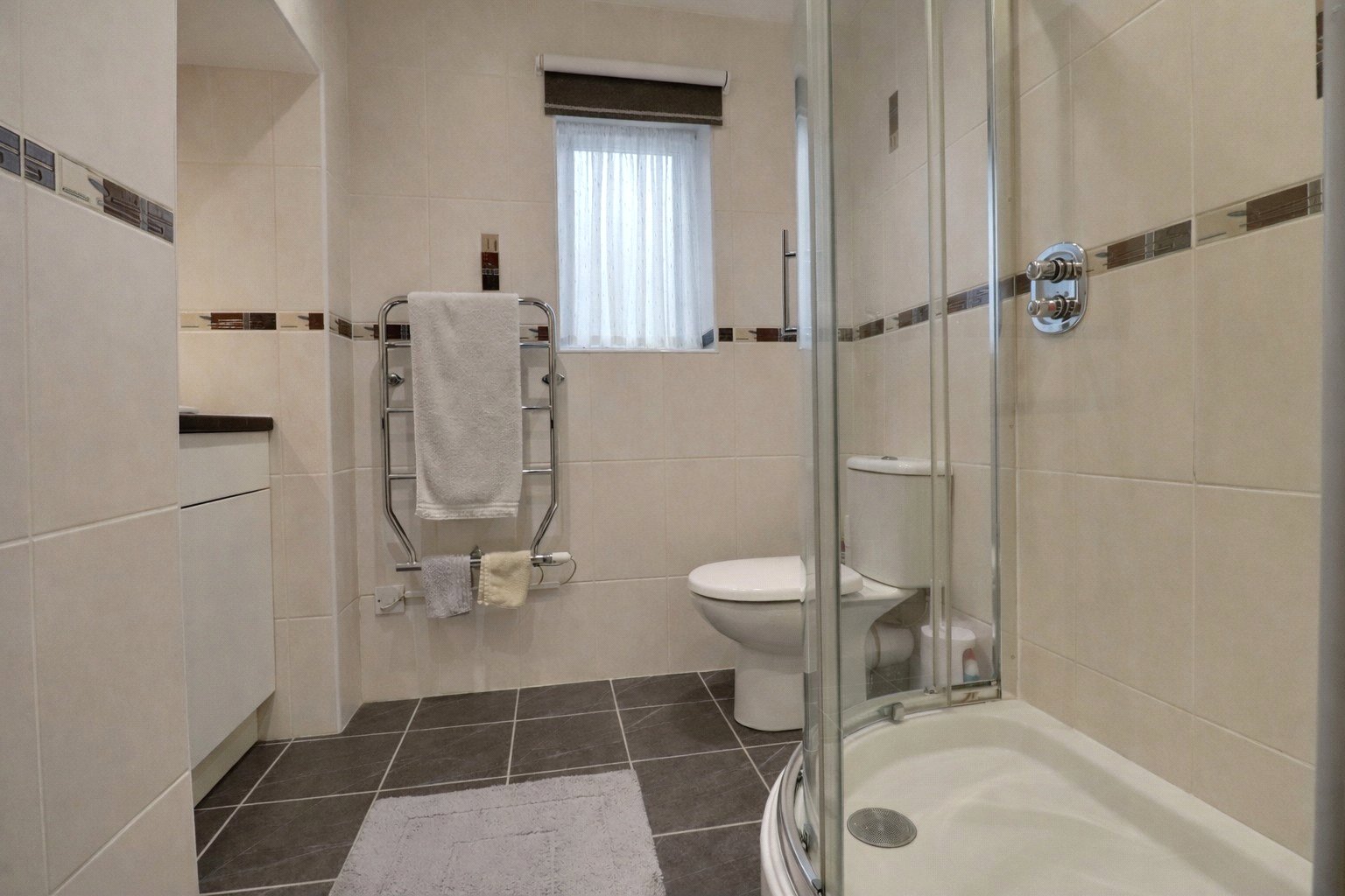 On the ground floor, the property is approached via an entrance porch leading into a particularly impressive living room, featuring a characterful fireplace with fitted wood burner, creating a warm and inviting space. An inner hall provides useful storage with two built-in cupboards and an airing cupboard, and gives access to the rear porch and garden. There is also a modern shower room fitted with a large glazed cubicle with thermostatic shower, built-in wash basin, WC, electric towel rail and the added comfort of electric underfloor heating. The fitted kitchen is well equipped with an excellent range of base and wall units, an electric cooker point, plumbing for a washing machine, space for a fridge and benefits from secondary double glazing.