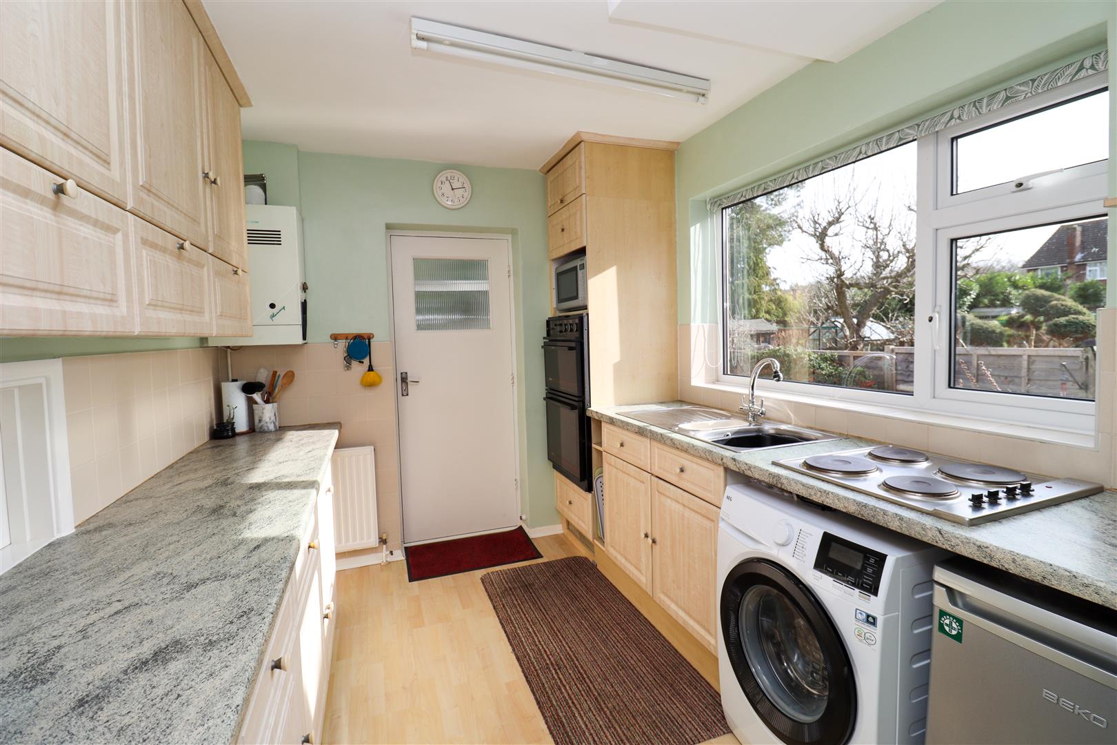 The kitchen comprises; eye and base level cupboard and drawer units with roll top work surfaces. Inset sink, space for utilities, built-in oven and hob.