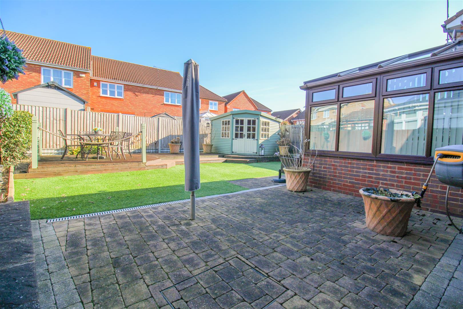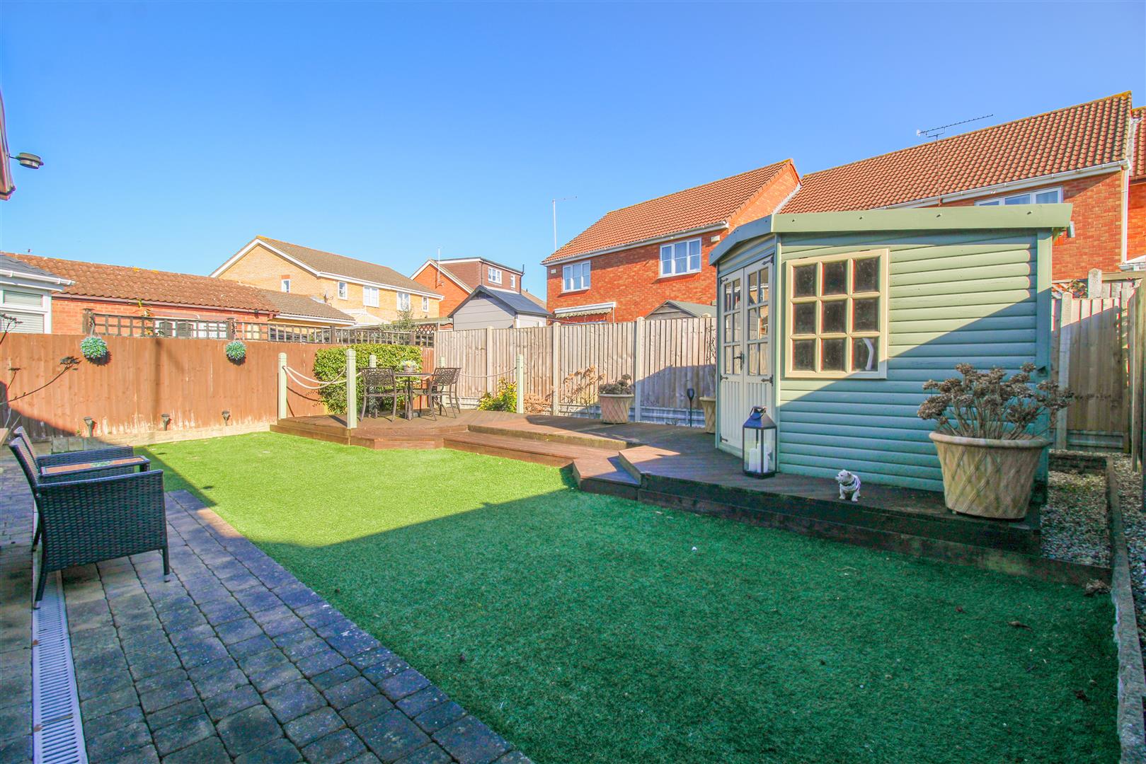 Located in a quiet cut-de-sac is this immaculately presented three bedroom detached family home with a large driveway and garage. On the ground floor there is an open plan lounge and dining area, a modern fitted kitchen with a range of wall and base units, a beautiful conservatory, a cloakroom/WC and access to the garage. Upstairs there is a bright landing which accesses the three bedrooms, all with fitted wardrobes, plus a stunning en-suite to the master and a family bathroom with a white three piece suite. Outside, the rear garden is mainly artificial lawn, with a raised decked area, a patio area, shed/summerhouse and access on both sides leading to the front garden and driveway for two vehicles. Elwood is located at the top of Church Langley, just off Lane End, within walking distance of excellent local schools, shops and open fields.