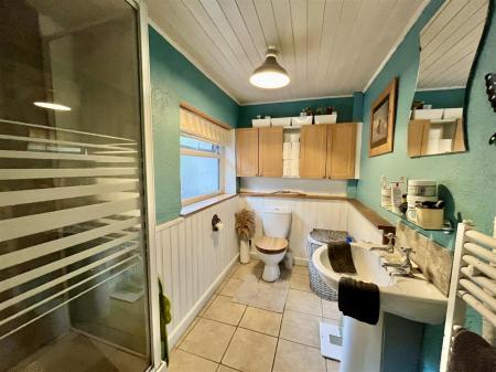 Shower Room - 2.69m x 1.98m (8'10 x 6'06) - Corner shower cubicle with electric shower, low level w.c, pedestal washbasin, heated towel rail, tiled floor, rear aspect obscured double glazed window.