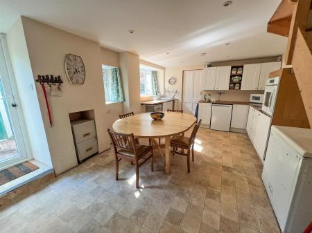 Kitchen/Dining Room - 5.11m x 3.40m (16'09 x 11'02) - Single bowl single drainer stainless steel sink unit with mixer taps over, range of base and wall mounted units, wood block worktop, plumbing for dishwasher, power points, electric induction hob, electric oven, inset ceiling spots, double radiator, stairs leading to the first floor, mains wired smoke alarm system, central heating thermostat controls, two side aspect double glazed windows, glazed panel door giving access into the Lounge. Door and small step into:
