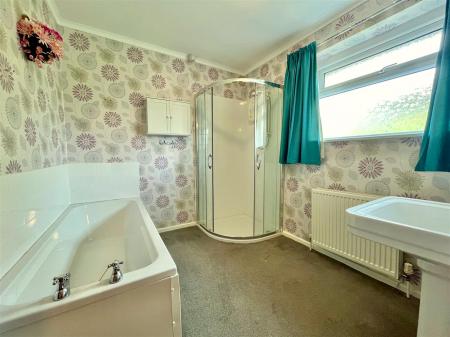 Bathroom - 2.59m x 2.36m (8'6" x 7'9") - White suite comprising a bath with tiled surround, walk-in shower cubicle with electric shower and tiled surround, pedestal handbasin with tiled splashbacks, radiator, obscured rear aspect window.