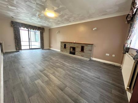 Lounge - 6.32m x 3.53m (20'09 x 11'07) - Ceiling light, wall light points, feature stone fireplace, gas fire inset (currently disconnected), double radiators, power points, two tv points, coving, exposed timber window ledge, front aspect woodgrain upvc double glazed window overlooking the front garden, set of double glazed sliding doors opening into: