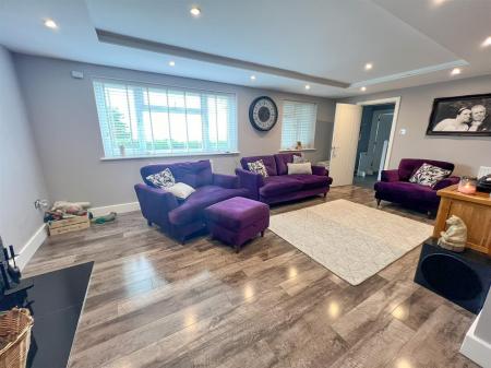 Lounge - 5.97m x 3.56m (19'07 x 11'08) - Custom feature ceiling moulding, LED lighting, dimmable inset ceiling spots, fireplace opening with tiled hearth and surround, wood burning stove inset, two double radiators, power points, tv point, wood effect flooring, front aspect upvc double glazed window opening into the porch, archway opening into dining room, large upvc double glazed window overlooking the front garden with far reaching views over countryside and the River Severn in the distance.