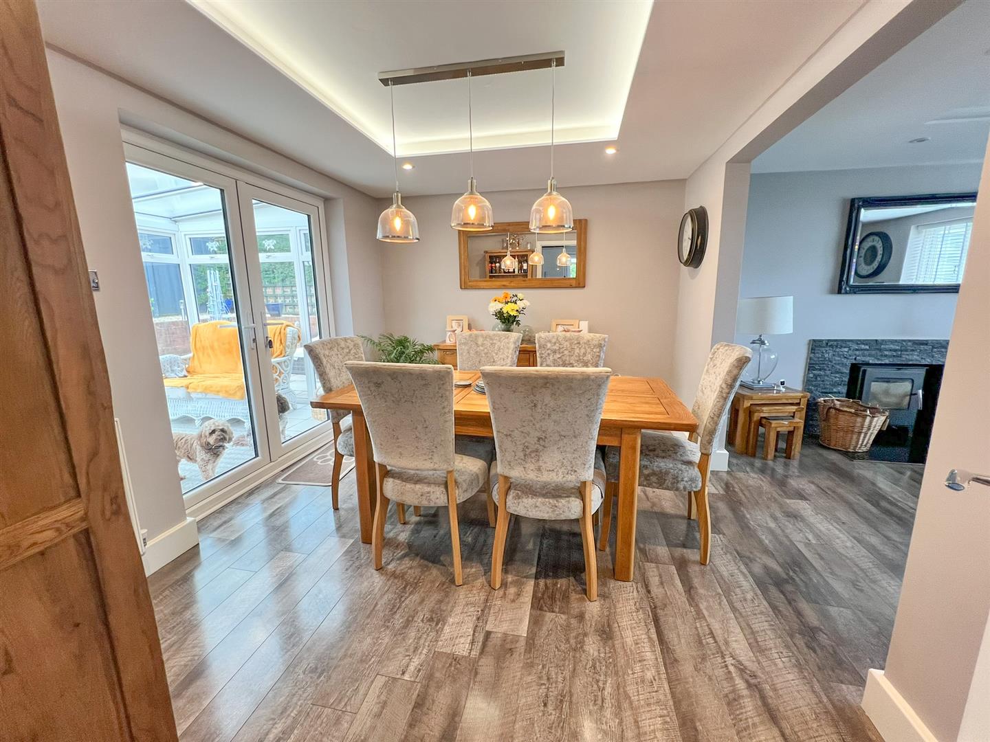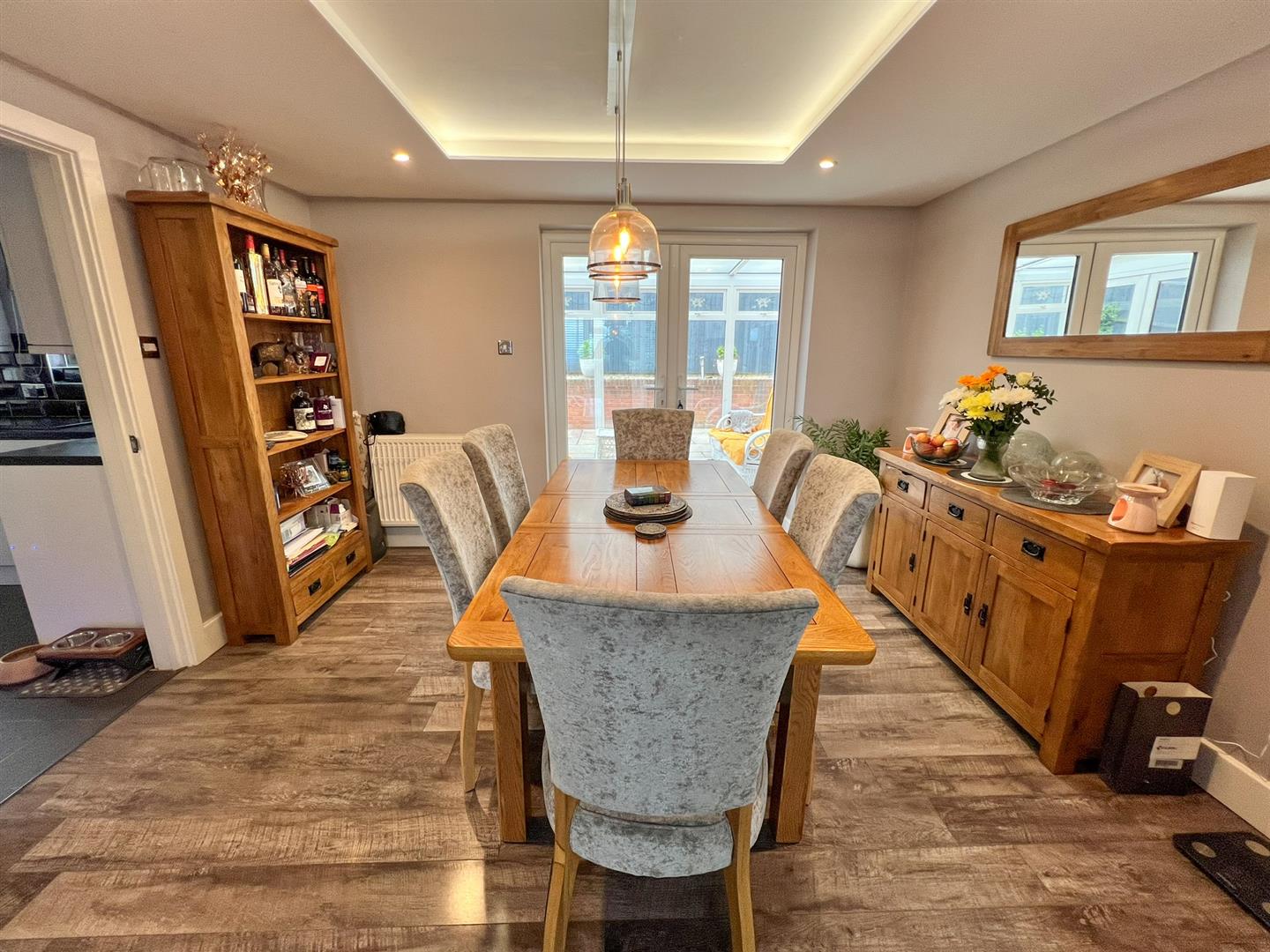 Dining Room - 3.68m x 2.84m (12'01 x 9'04) - Custom feature ceiling moulding, LED lighting, inset dimmable ceiling spots, ceiling light, double radiator, wood effect flooring, power points, pair of double glazed French doors opening into the conservatory, wooden door giving access into the: