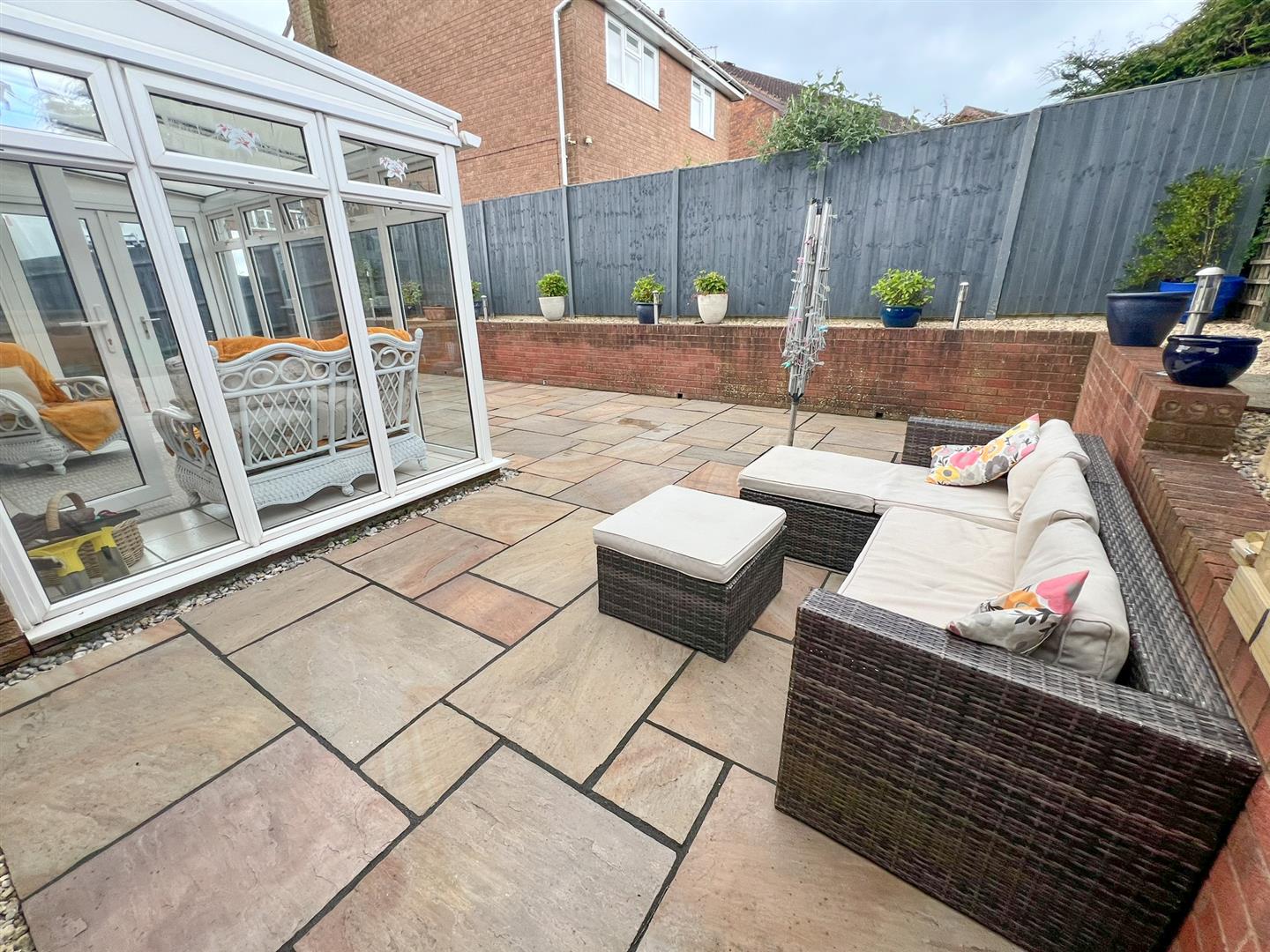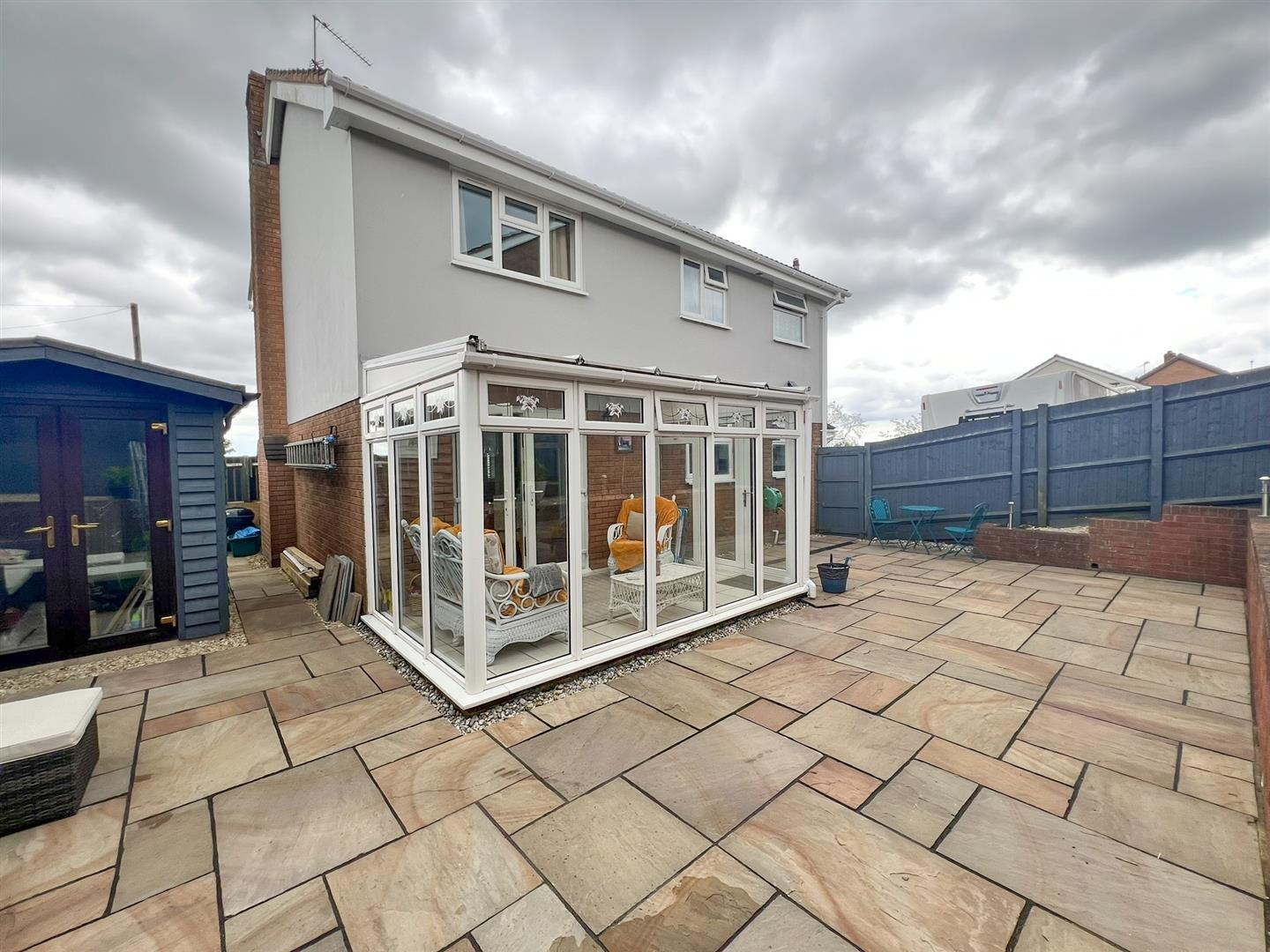 Benefitting from outside lighting and power points, and gated access to the rear garden. The rear garden is designed for low maintenance, with a patio, retaining wall with gravel beds, a small detached summer house, and a storage area ideal for wood and bin storage. The garden is enclosed by walling and fencing and features outside lighting, solar lighting, and an outside tap.