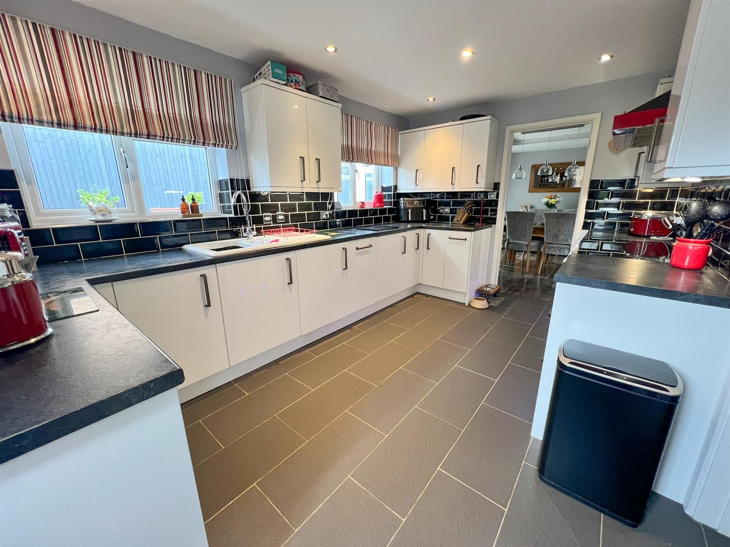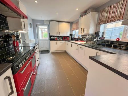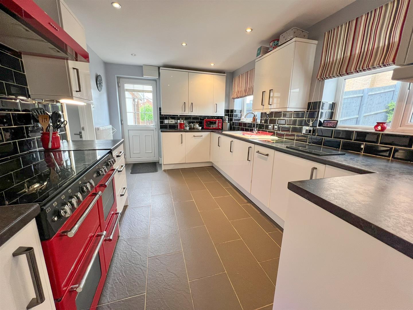 Kitchen - 4.29m x 2.84m (14'01 x 9'04) - One and a half bowl single drainer cast porcelain sink unit, rolled edge worktops, tiled surrounds, ample power points, range of base and wall mounted units, central heating timer controls, BT Openreach sockets, space for range cooker with filter hood over, integrated dishwasher, washing machine and fridge, gas fired central heating and domestic hot water boiler, continuation of the inset ceiling spots, single radiator, side aspect Georgian bar upvc double glazed door with integrated blind opening onto the driveway, two rear aspect upvc double glazed window overlooking the rear garden.