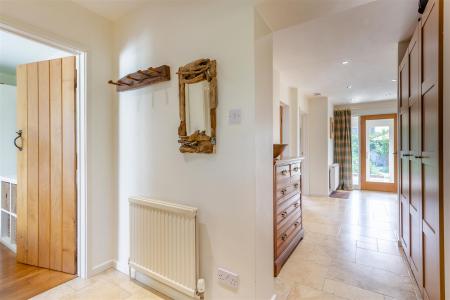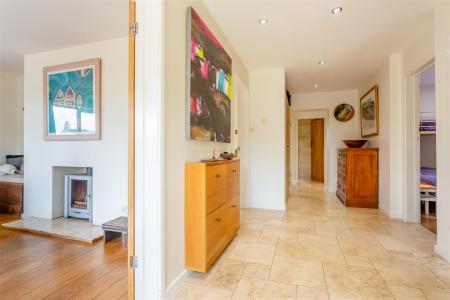 Entrance Hall - A bright, spacious and welcoming central hall with radiators, airing cupboard, travertine stone tiled floor, thermostat heating controls, doors lead off of the central hall to the living spaces and bedrooms.