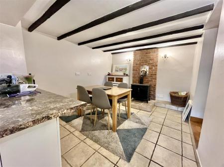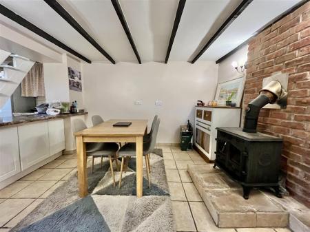 The dining area features a cast iron multi fuel burner sat on a raised stone hearth, tiled floor, opens into;