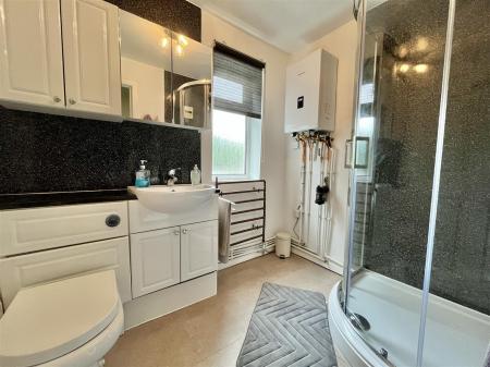 Shower Room - 2.34m x 1.83m (7'08 x 6'00) - Comprising a modern suite to include a walk-in corner shower cubicle with mains fed shower, vanity sink unit and low level w.c. Radiator, wall mounted gas-fired combi boiler installed August 2024. Obscured side aspect window.
