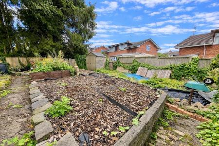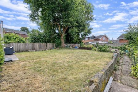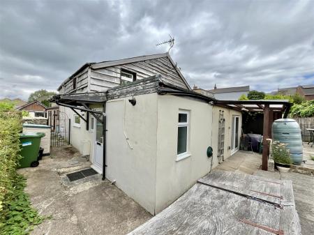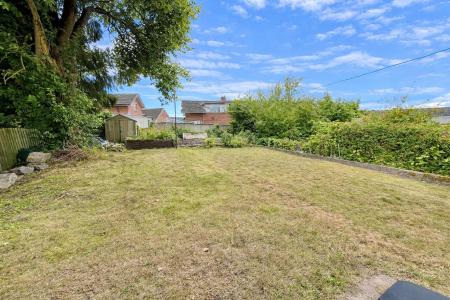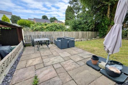 Outside - A pathway runs along the frontage of the neighbouring property, leading to a gated entrance and on toward the welcoming canopied porch and garden. The sunny south-facing garden features a patio ideal for outdoor seating, alongside a neatly kept lawn, well-stocked flower and shrub borders, and a useful storage shed.