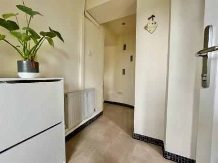 Hallway - Radiator, curved feature wall with inset glass blocks, door leads to the shower room, the hallway leads to the kitchen/diner.