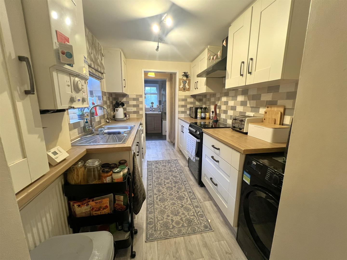 Kitchen - 3.07m x 2.06m (10'01 x 6'09) - Modern fully fitted kitchen comprising of a range of wall and base mounted units with wood effect worktops, integrated one and a half bowl stainless steel sink and drainer with mixer tap above, electric oven with integrated four ring gas hob, glass splashback and cooker canopy above, plumbing for washing machine, space for tumble dryer, wall mounted worcester bosch gas combi boiler, part tiled walls, wood flooring, power points, side aspect window, opening into: